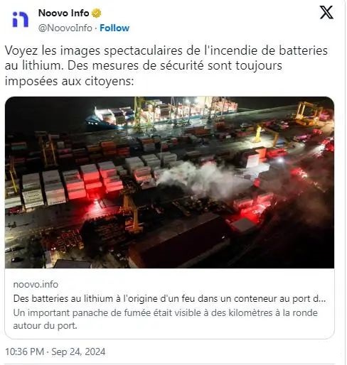 據(jù)外媒的報道稱,當(dāng)?shù)貢r間 9 月 23 日(星期一)下午 3 點 15 分左右,加拿大蒙特利爾港碼頭(Montreal)上一裝有 15 噸 鋰離子電池 的集裝箱著火。