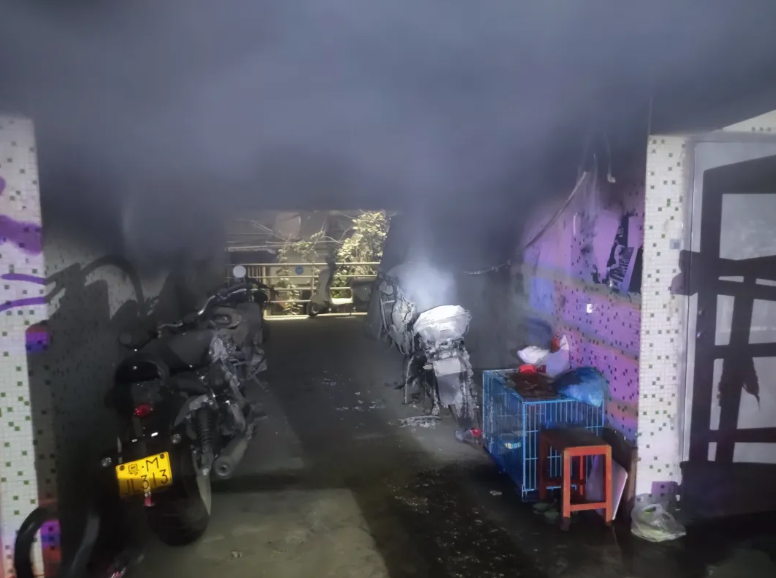 2024914日晚,廣東深圳光明區(qū)一小區(qū)專用車房走道內(nèi)電動(dòng)自行車著火。