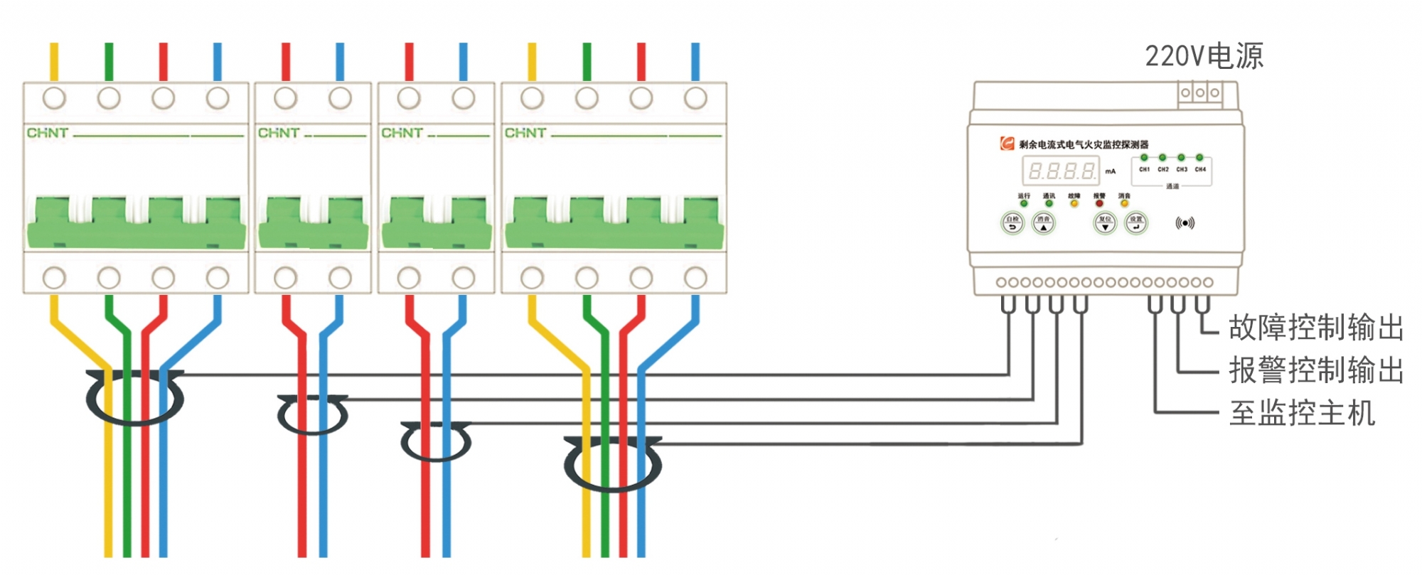 ●工作電壓:AC220V/50Hz ●探測容量:4只互感器/4只溫度傳感器