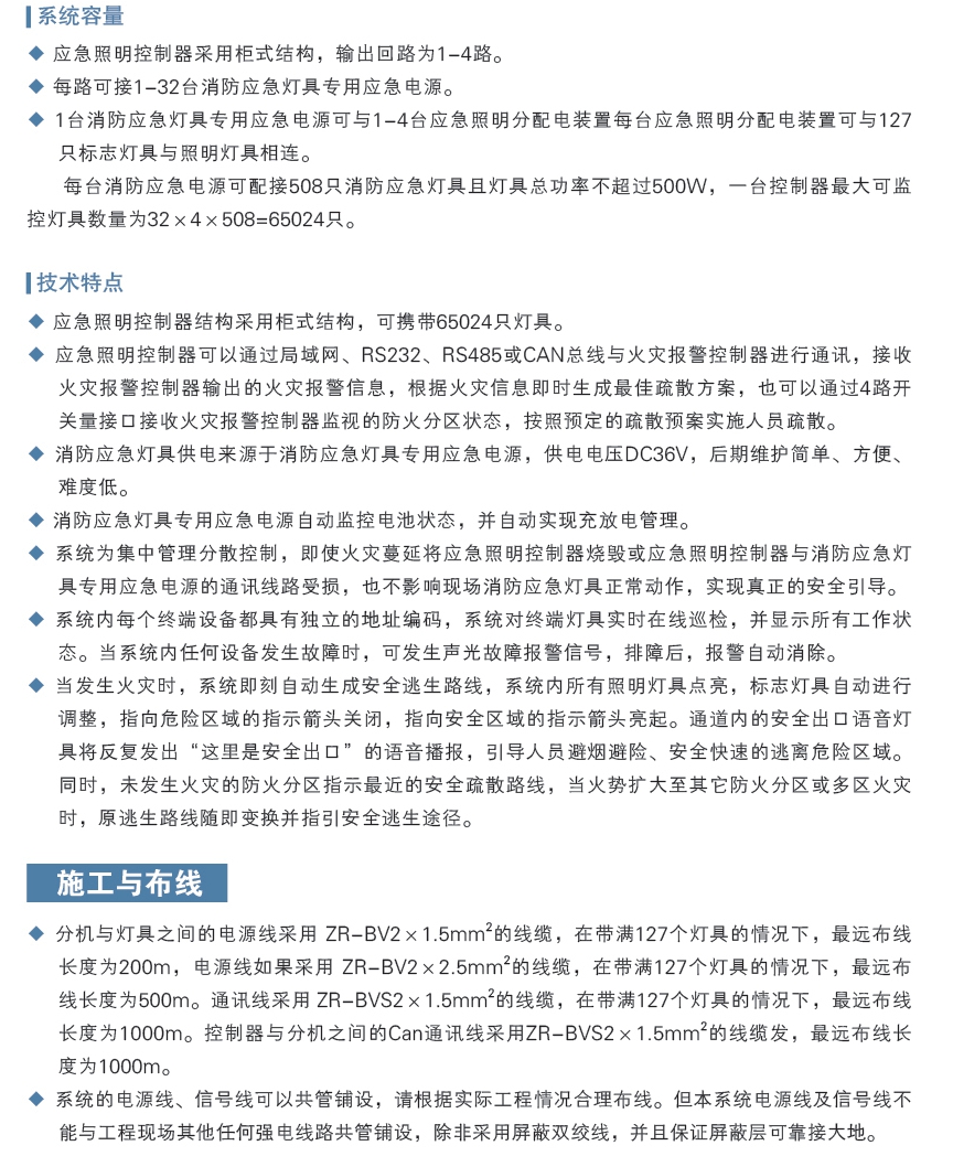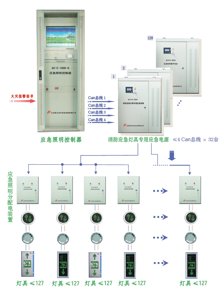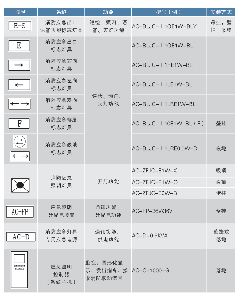 系統(tǒng)產(chǎn)品由應(yīng)急照明控制器、消防應(yīng)急燈具專用應(yīng)急電源、應(yīng)急照明分配電裝置、消防應(yīng)急照明、消防應(yīng)急標志燈具四部分組成。照明燈具指示系統(tǒng)有壁掛式、吸頂式、嵌頂式等,標志燈具指示系統(tǒng)有壁掛式、吊掛式、嵌墻式、嵌地式等組成。