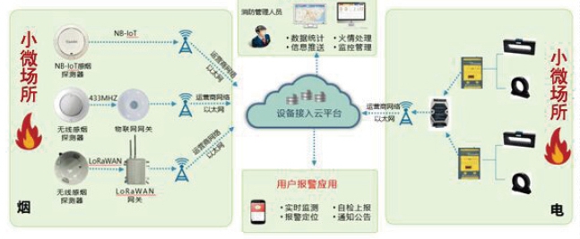 聯(lián)網(wǎng)場所發(fā)生火警或故障,通過溫度傳感器、剩余電流互感器等前端設(shè)備監(jiān)測到的信息,通過傳輸裝置上傳至云服務(wù)中心,消防部門可通過監(jiān)控中心以及手機終端獲取實時上傳的火警信息,及時確認(rèn)火警真?zhèn)危⒖焖偬幚怼?/p>